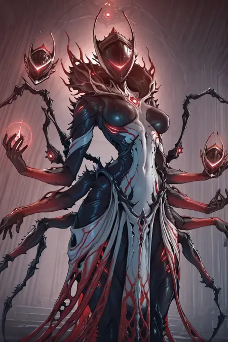 1girl, Orixia, warframe, glowing, arthropod girl, helmet, extra limbs, spider limbs, sleek body,