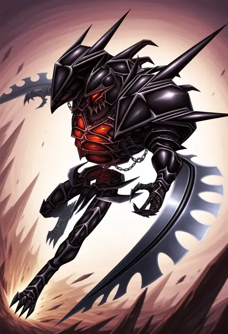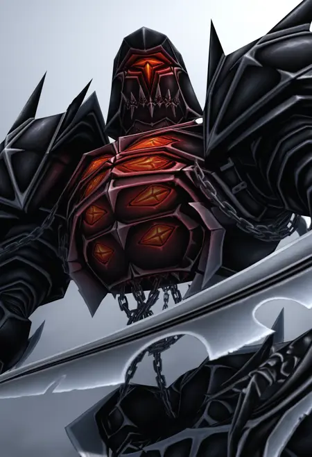 enchanted armor, floating upper body, glowing chestplate, armored legs, chains, arm blades, pauldrons, blade tassets, helmet