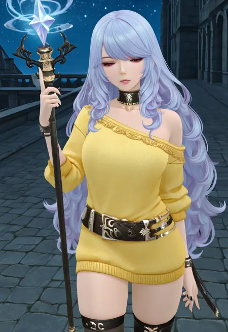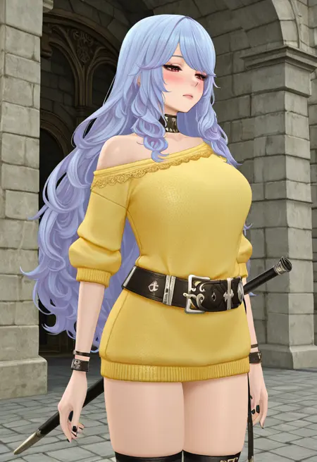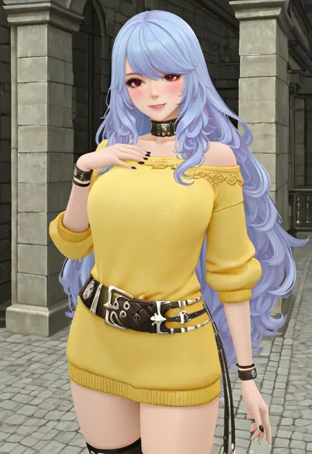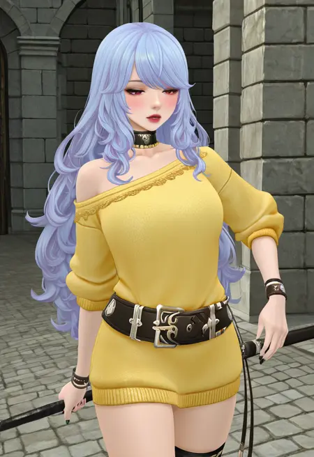 acllabyo_(granado_espada), 1girl, solo, 成熟した女性, 青髪, カールした髪, 非常に長い髪, 赤い目, 唇, 大きな胸, 前髪を流したスタイル, チョーカー, 肩出し, 锁骨, セーター, 黄色のセーター, セータードレス, シース, 黒い爪, ブレスレット, ベルト, ルーズなベルト, 黒いレグウォーマー, 非対称な脚元の装い, 黒いハイヒール,