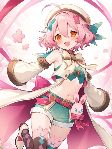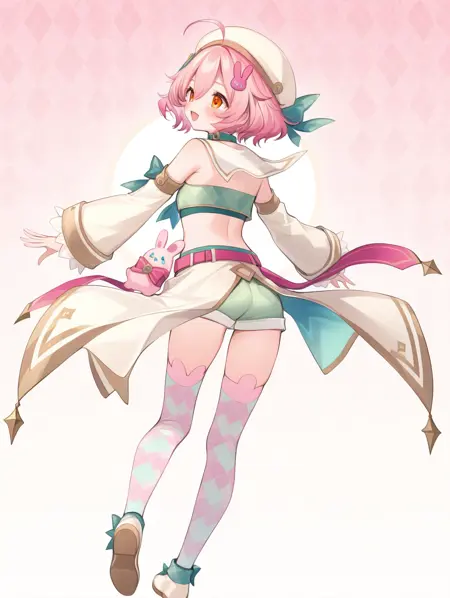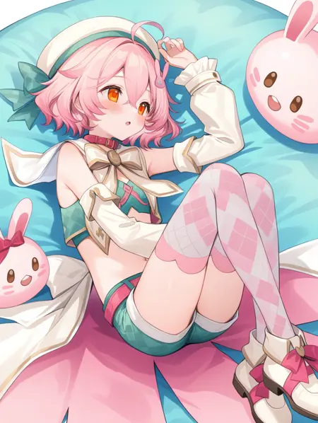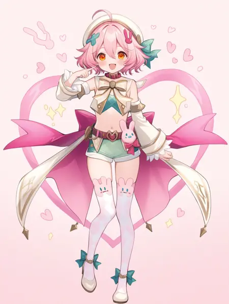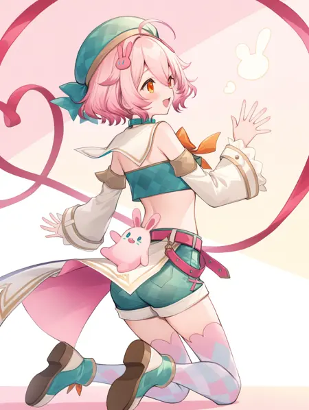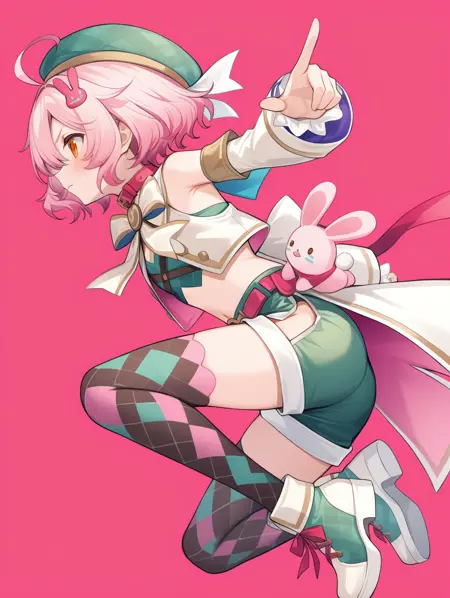 프롬프트 예시: yunnai,pink hair,short hair,orange eyes,hair ornament,beret,ribbon,green crop top,green short shorts,collar,detached sleeves,belt,coat,thighhighs,shoes,argyle clothes,ahoge,pink rabbit hair ornament,