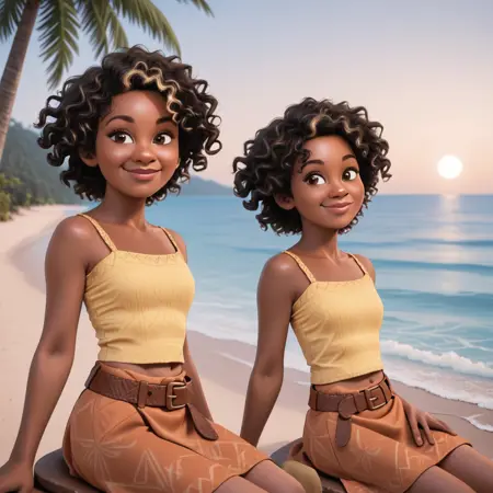 zzLOTOzzmoanazz, 1girl, solo, brown eyes, brown hair, two-tone hair, short hair, curly hair, blonde tuft, lips, dark skin, dark-skinned female, yellow camisole, bare shoulders, midriff, belt, skirt