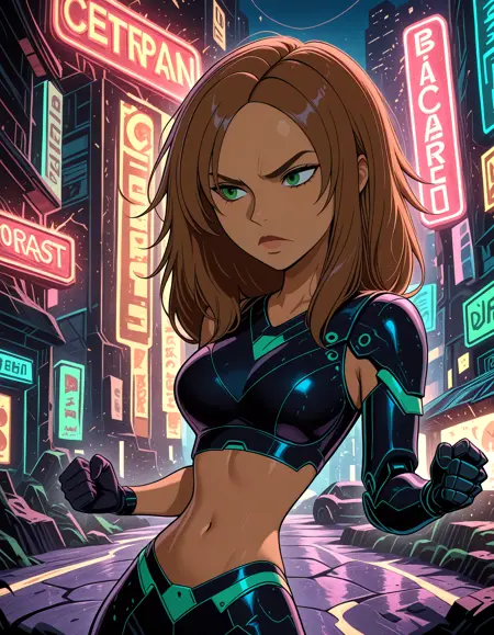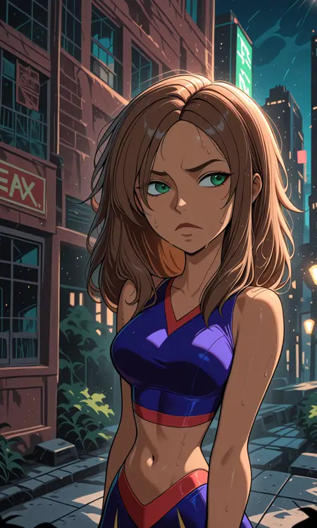 - V1B0nn1e, 绿色眼睛, 棕色头发, 中等胸部, 中等长度头发, 深色皮肤女性