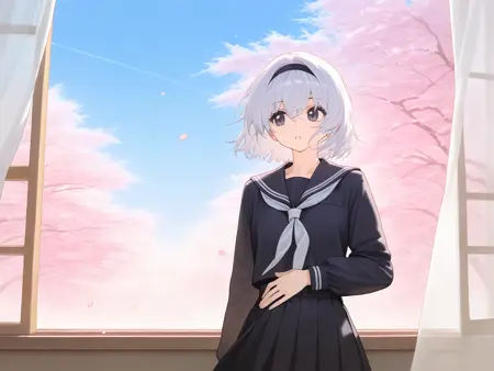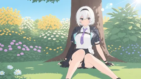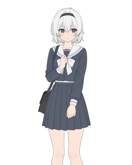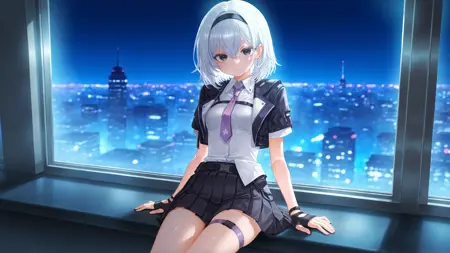 태그:1소녀, 싱글, 하얀 머리카락, 눈 사이의 머리카락, 검은 눈, 검은 헤어밴드, 단발, 열린 재킷, 검은 주름 치마, 검은 장갑, 벌거벗은 다리, 허벅지 스트랩, 보라색 넥타이,
