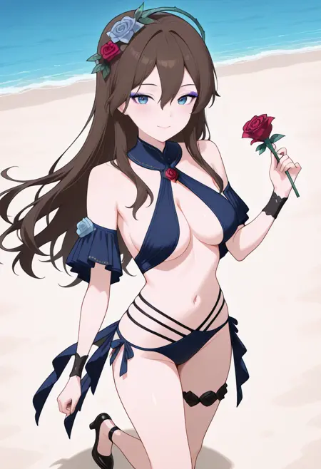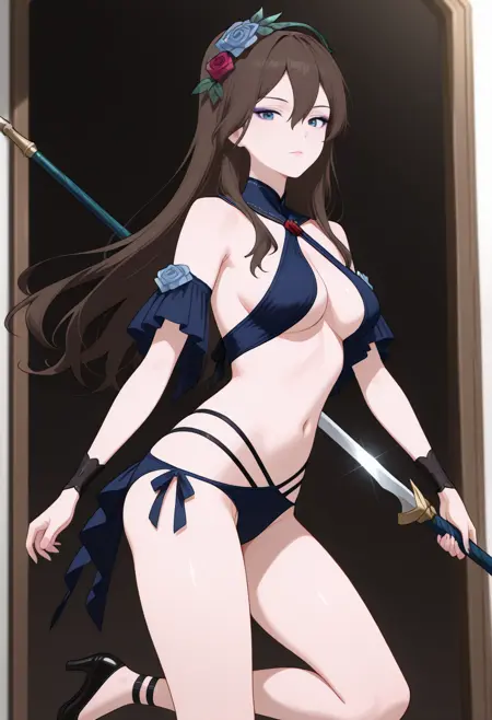 blueswimsuitv1, swimsuit, bikini, blue swimsuit, halter top, high collar, bare shoulders, bare back, strappy, ribbons, navel, cleavage, high heels, ankle strap heels, armbands, gold accents, frills, backless, side boob