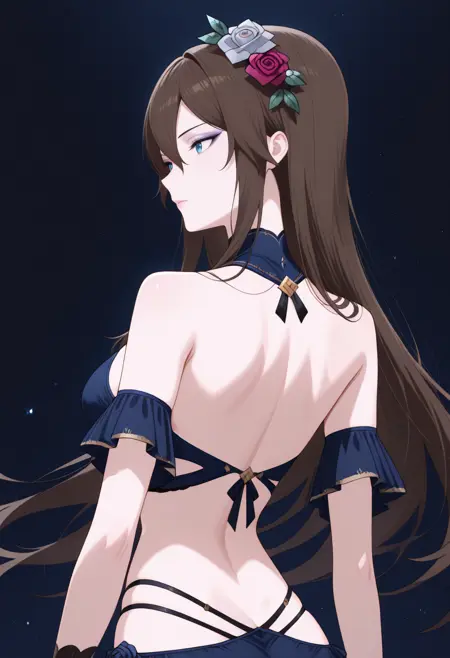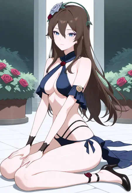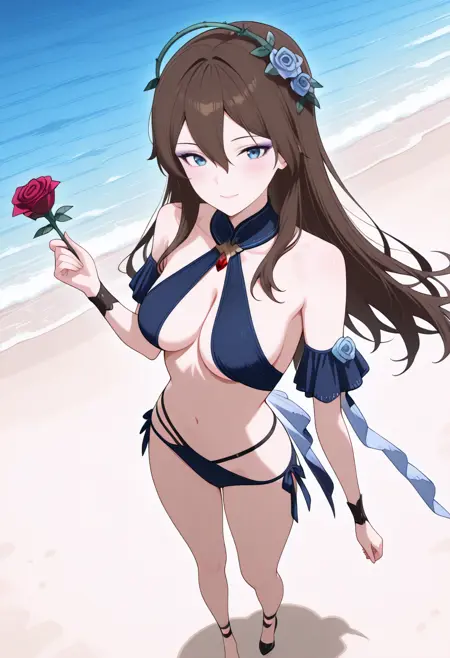 blueswimsuitv1, swimsuit, bikini, blue swimsuit, halter top, high collar, bare shoulders, bare back, strappy, ribbons, navel, cleavage, high heels, ankle strap heels, armbands, gold accents, frills, backless, side boob