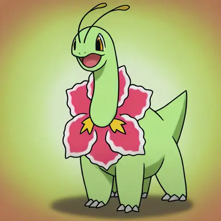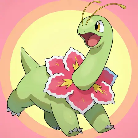 meganium, pokemon (creature), quadrupedal, sauropod, light green skin, two antennae, three claws on each foot, pink flower around neck with six petals