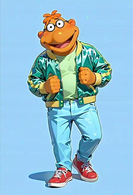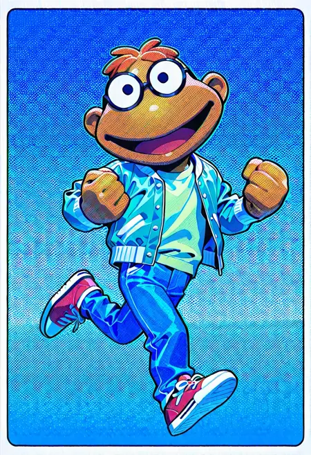 Sco0terTM, 1boy, bright orange skin, curly red-orange hair, round black glasses, expressive black eyes, green jacket with yellow accents, light blue shirt, blue pants, red shoes
