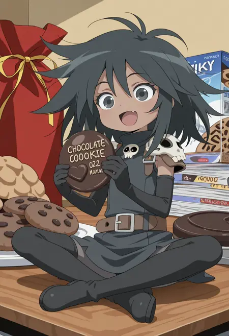 appearance : witch hat, black hair, medium hair, messy hair, dark skin, black eyes, black dress, skull on shoulder, black elbow glove, belt, gray pantyhose, black thighhigh boots,