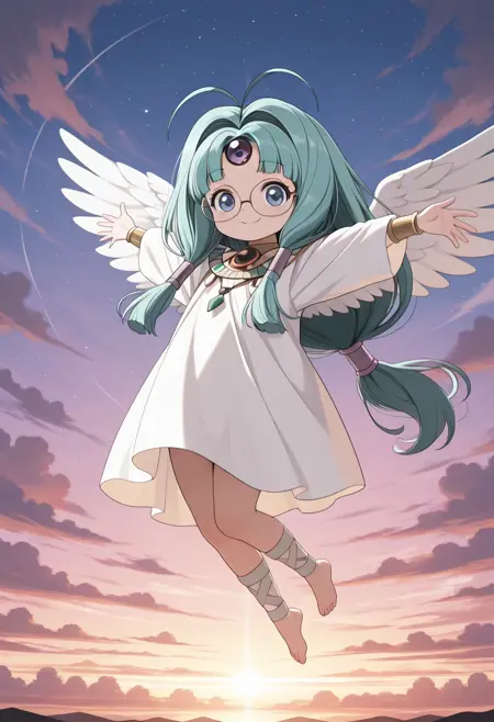 appearance : aqua hair, blue eyes, antenna hair, low tied long hair, jewelry, forehead jewel, white dress, angel wing, glasses, hair tube, barefoot,