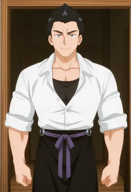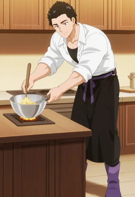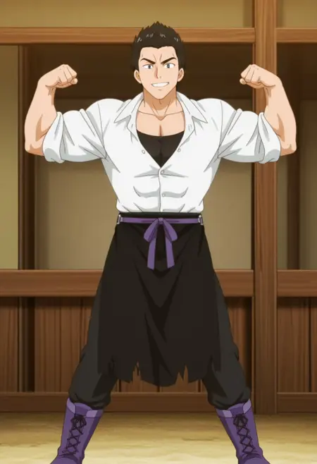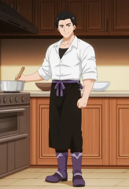 普段の服:シャツ、鎖骨、白いシャツ、ブーツ、襟付きシャツ、ズボン、黒いアンダーシャツ、袖をまくった、一部ボタンを開けた、紫色の靴、襟を開けた、黒いズボン