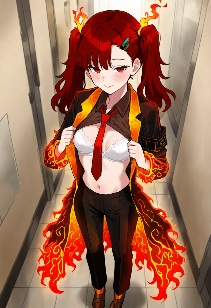 dark brown shirt, red necktie, fire vest, black fire coat, black armband, black pants, brown footwear