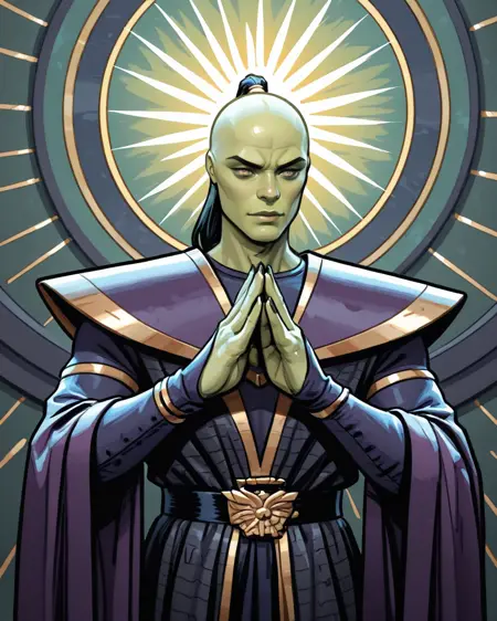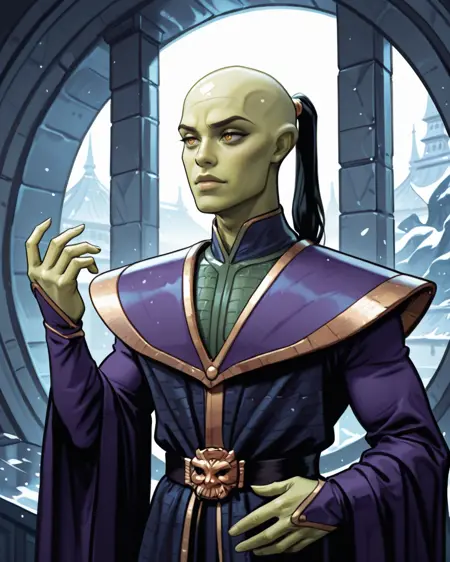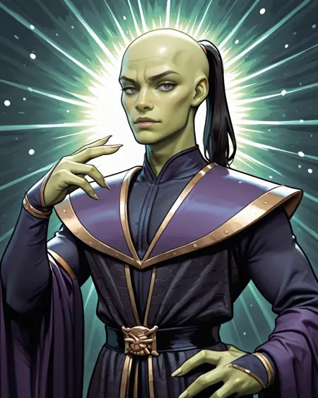 触发词:xizor,男性焦点,有色皮肤,绿色皮肤,光头,马尾辫,长袍,权杖,手持权杖,靴子