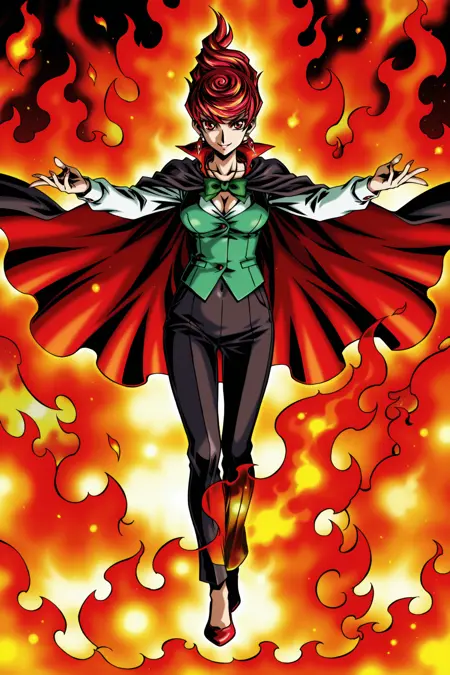 yugioh_card_style, yugioh_card_for_mr_volcano, 레드 아이즈, 빨간 머리, 불타는 빨간 머리, 나선형 헤어스타일, 귀걸이, 목걸이, 큰 가슴, 데리골돌, 덮인 배꼽, 흉선, 미소, 녹색 조끼, 녹색 리본 넥타이, 빨간 안감이 있는 검은 망토, 공식적인 판타지 복장, 빨간 하이힐