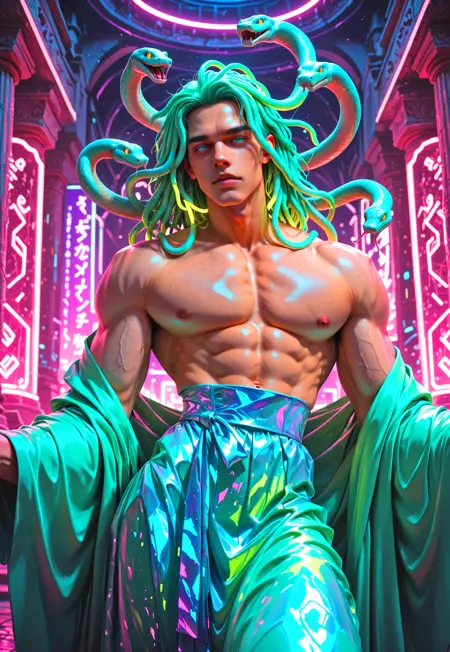 holographic color thong, holographic beanie, holographic jacket, exposed chest, holographic thong, holographic thigh highs,