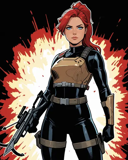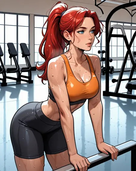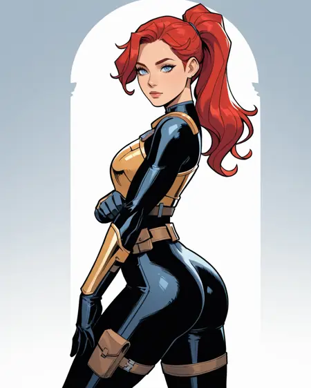Classic: scarlettgijoe, 1girl, red hair, blue eyes, ponytail, leotard, hair over one shoulder, belt, gloves,