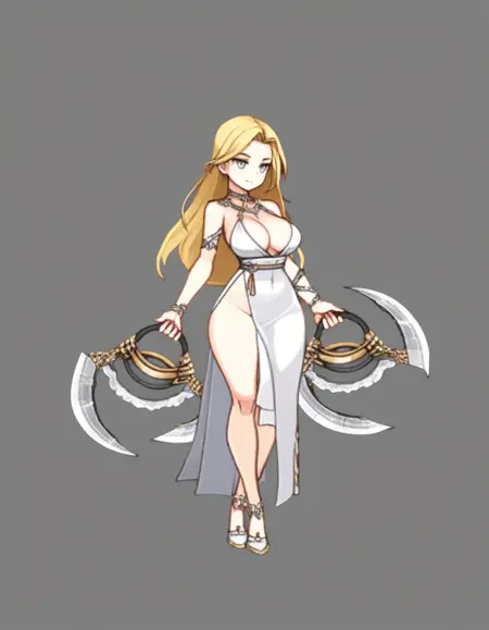 {human|elf|cat girl|bunny girl|dragon girl|demon girl|vampire}, {warrior|mage|archer|assassin|ninja|healer|vanguard|fighter|priest|npc}, {sword|katana|greatsword|dagger|daggers|scythe|chakram|polearm|lance|mace|hammer|gauntlet|gauntlets|orb|staff|shield|pistol|folding fan|lantern|spellbook|unarmed}, {armor|light armor|fur outfit|dress|kimono|swimsuit|demon outfit|maid}