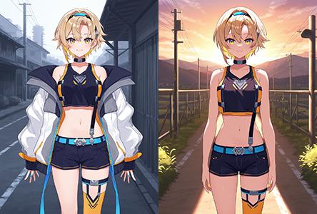 초커, 탱크탑, 한쪽 어깨스트랩, 벌어진 재킷, 짧은 반바지,또는