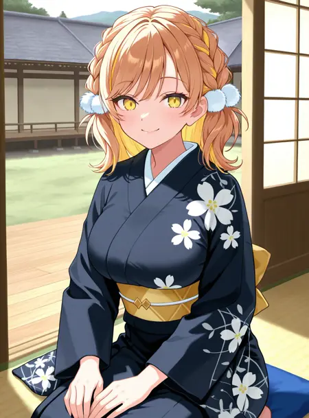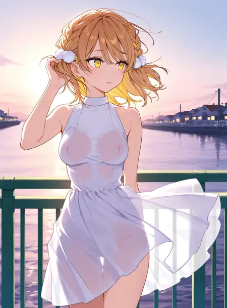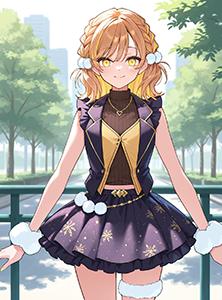 갈색 머리, 옆 페치, X형 헤어 장식, 꽃 귀걸이,옷: