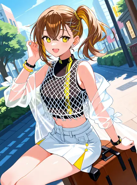 피시넷 크롭탑, 팔찌, 미니스커트, 투명한 벌어진 셔츠,신발: