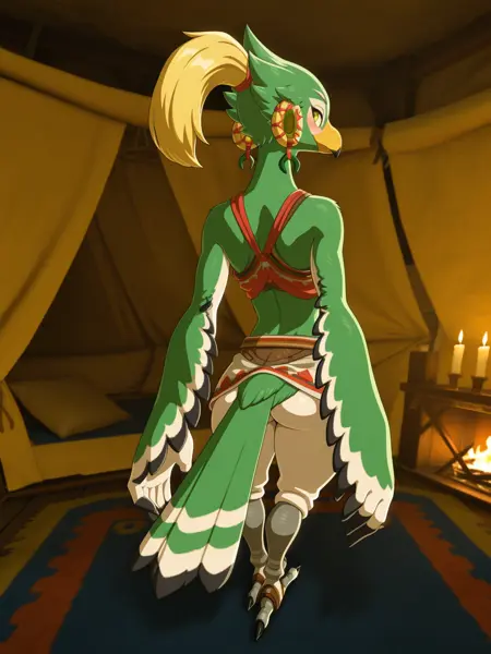 追加タグ: ファリー、全身、ブロンドのポニーテール、緑の髪、黄色い目、くちばし、イヤリング、ノースリーブシャツ、ベルト、ミニスカート、翼のある腕、鳥の尾、爪