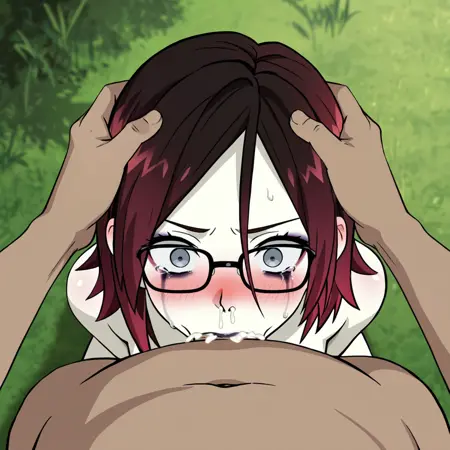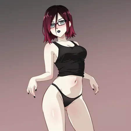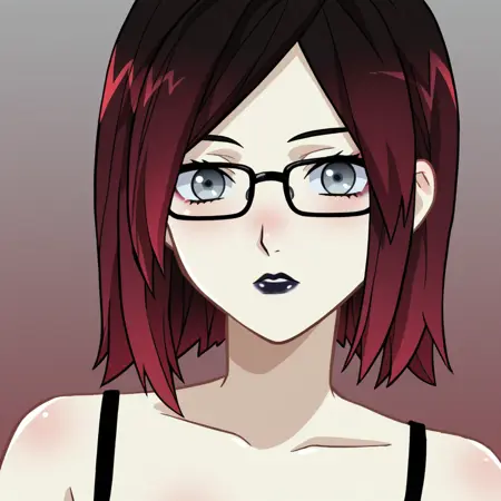 natsume_1, square black glasses, grey eyes, red-black gradient hair, black lipstick,