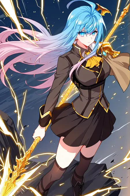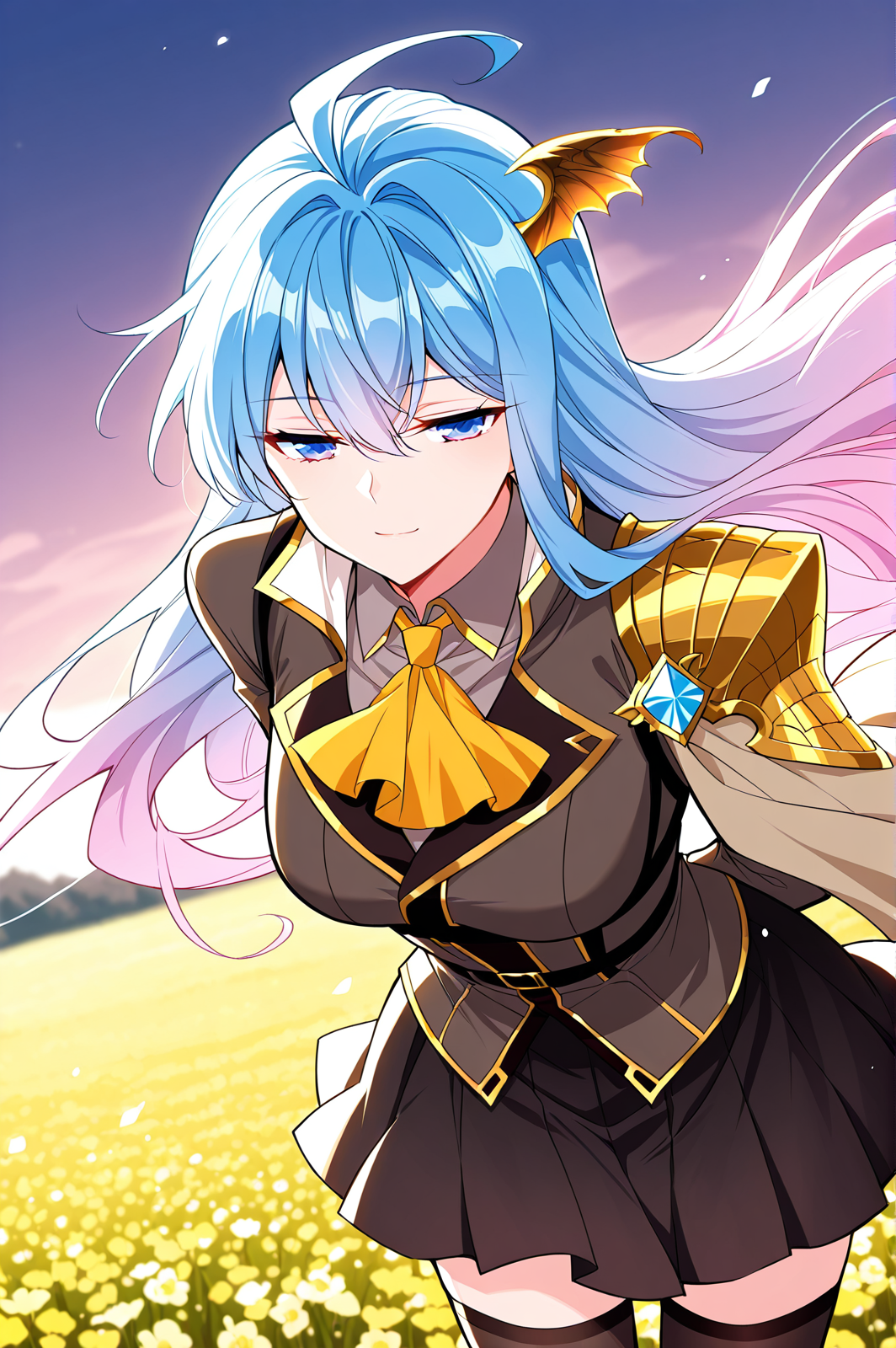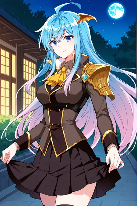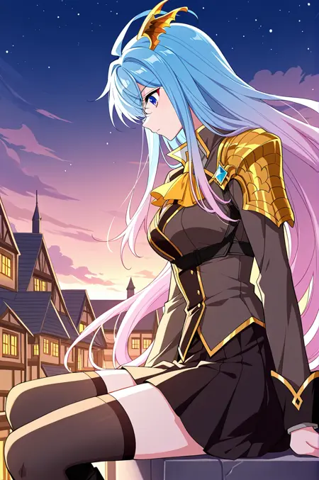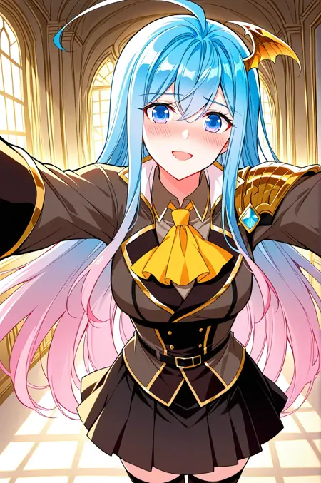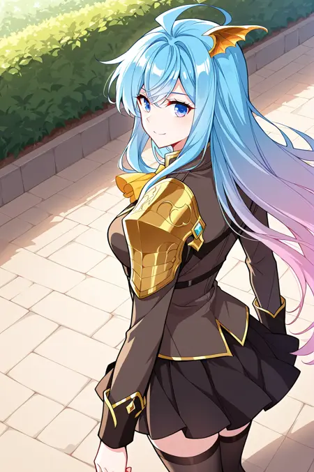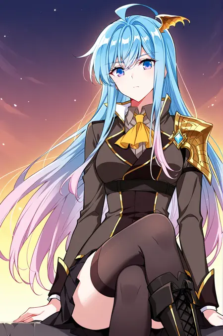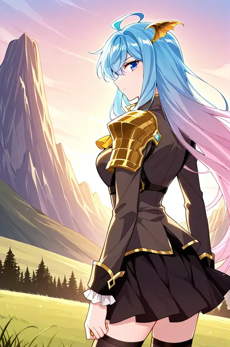 | 학습된 단어 | Wang, 1 girl, solo, long hair, gradient hair, blue to pink hair, side bangs, swept bangs, ahoge, antenna hair, blue eyes, hair ornament, metallic hair accessory, golden head ornament,복사됨! Wang_outfit, black uniform, gold trim, military-style outfit, long sleeves, structured jacket, fitted uniform, pleated skirt, short black skirt, black thigh-highs, black boots, yellow ruffled ascot, shoulder armor, golden armor, asymmetric shoulder pad, waist belt, black belt, contrast trim, underbust strap, high waist belt복사됨! |