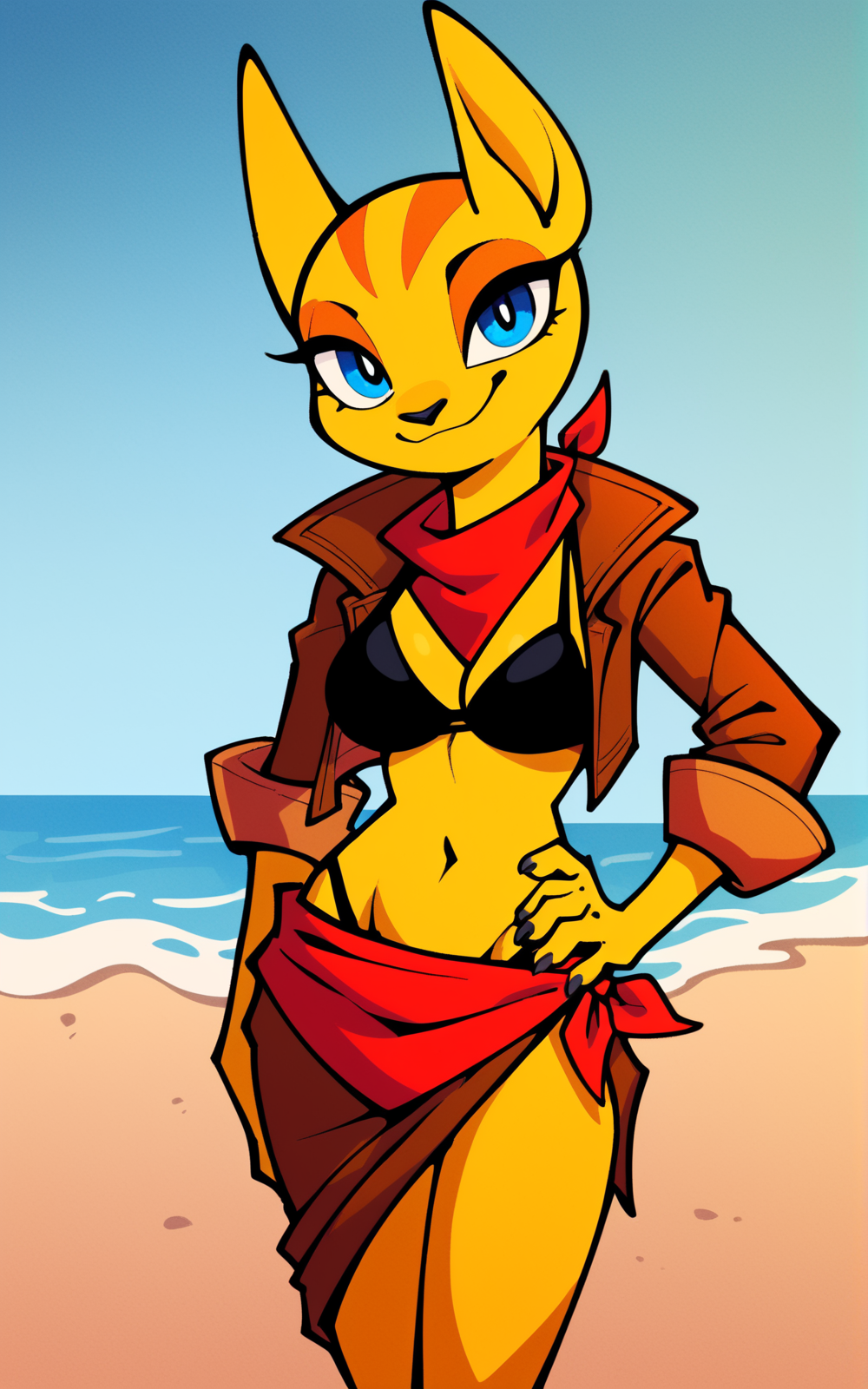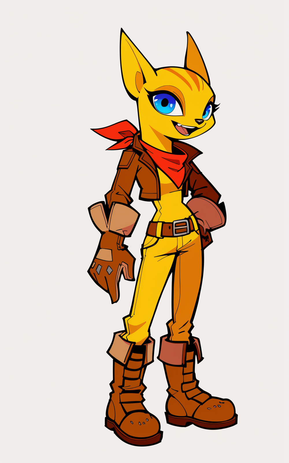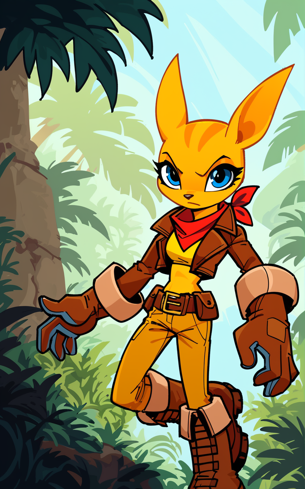 她的服装:靴子,棕色鞋履,裤子,黄色裤子,腰带,手套,衬衫,黄色衬衫,夹克,棕色夹克,长袖,头巾,红色头巾,颈部头巾**