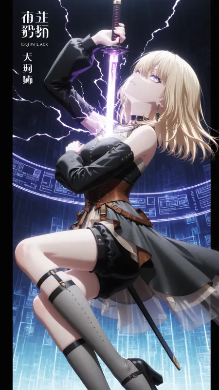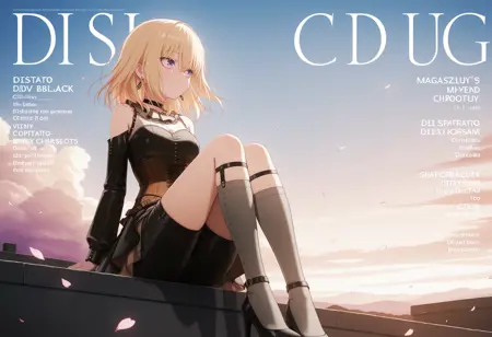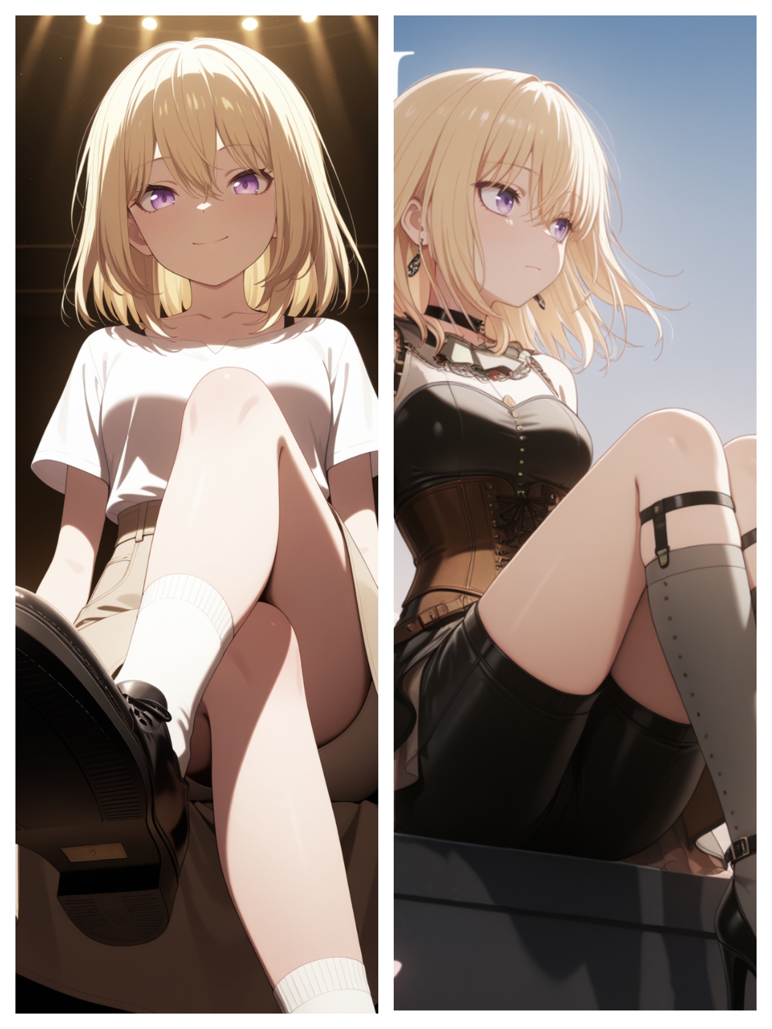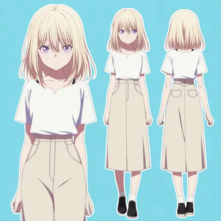 Prompt 标签: Misumi Uika,blonde hair,hair between eyes,medium hair,purple eyes,