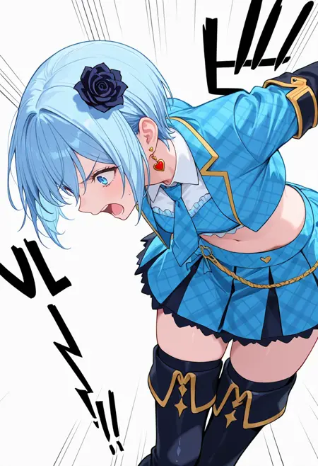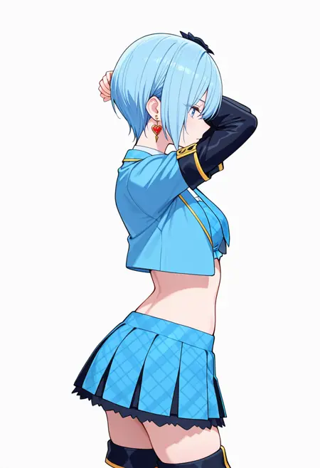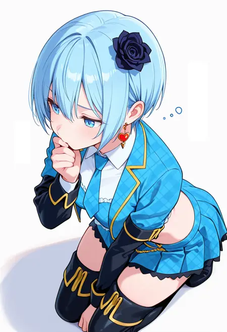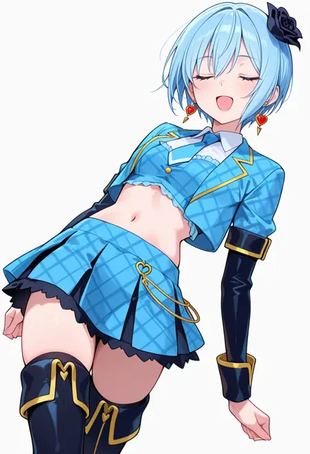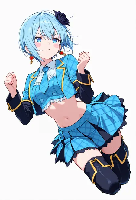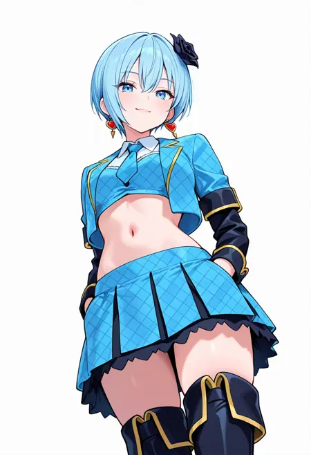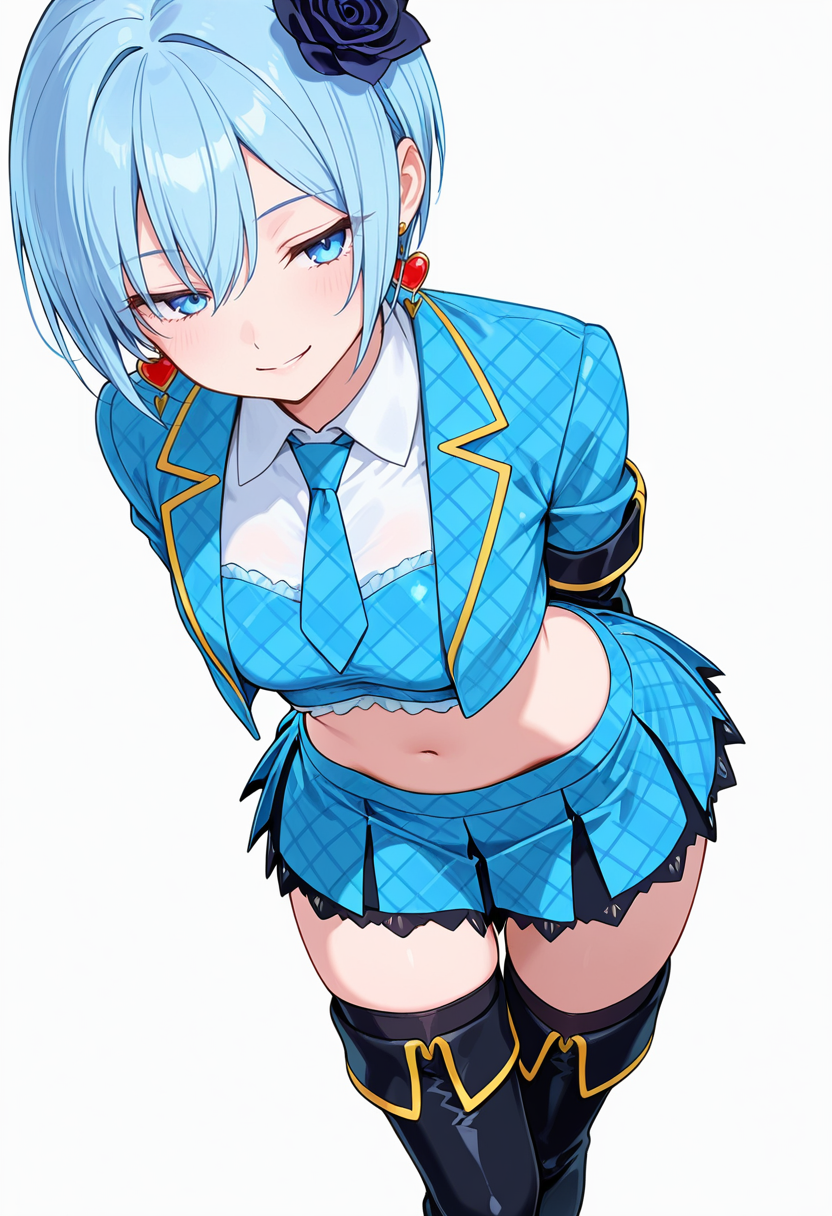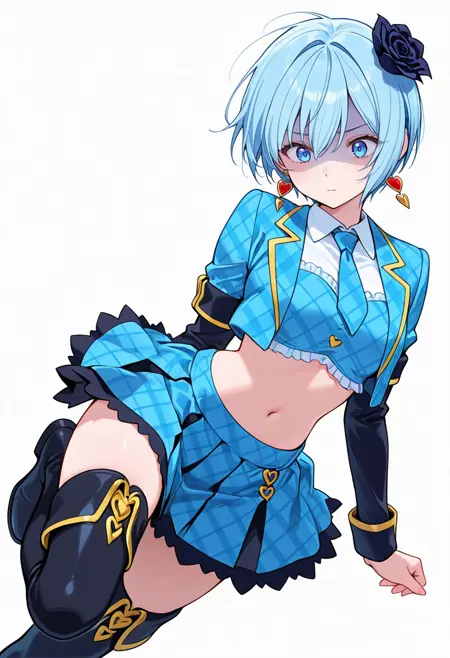 midriff,blue skirt, plaid skirt,crop top,blue jacket,blue necktie,black thighhighs,thigh boots,heart earrings,hair flower,zettai ryouiki,