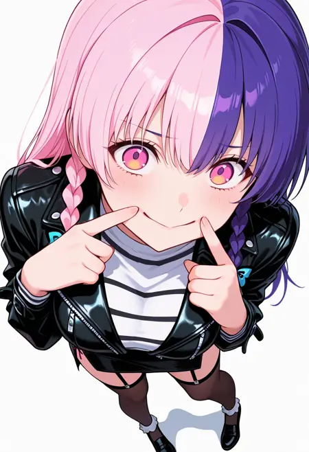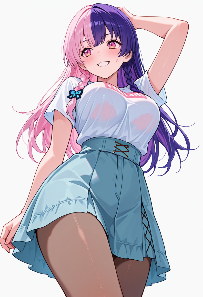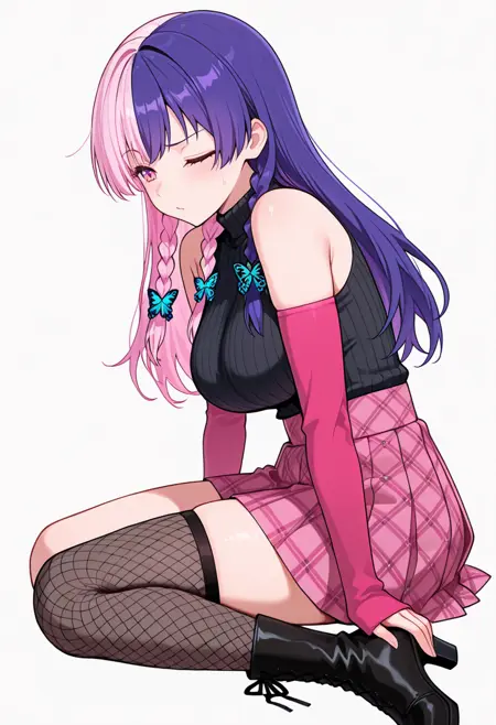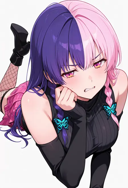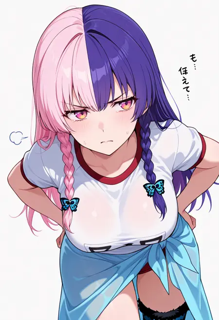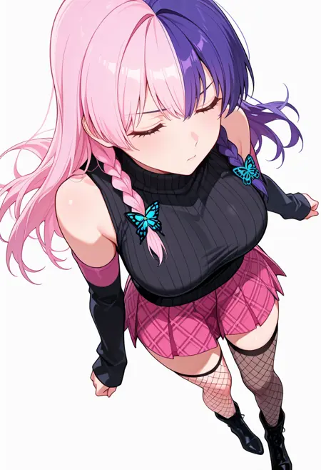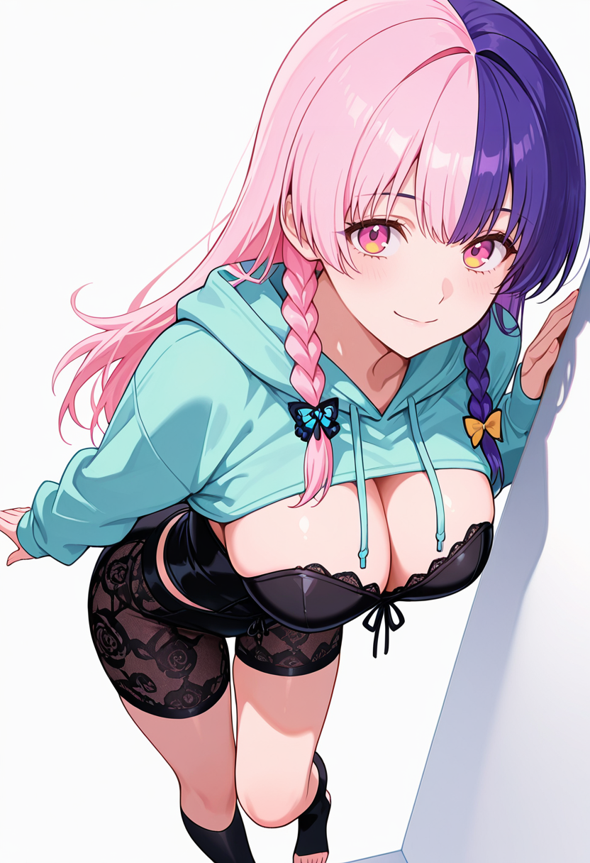 nagomis2_cnr, 1girl, 粉色头发, 紫色头发, 双色发, 长发, 双马尾, 侧边辫子, 刘海, 粉色眼睛, 多色眼睛, 大胸部,