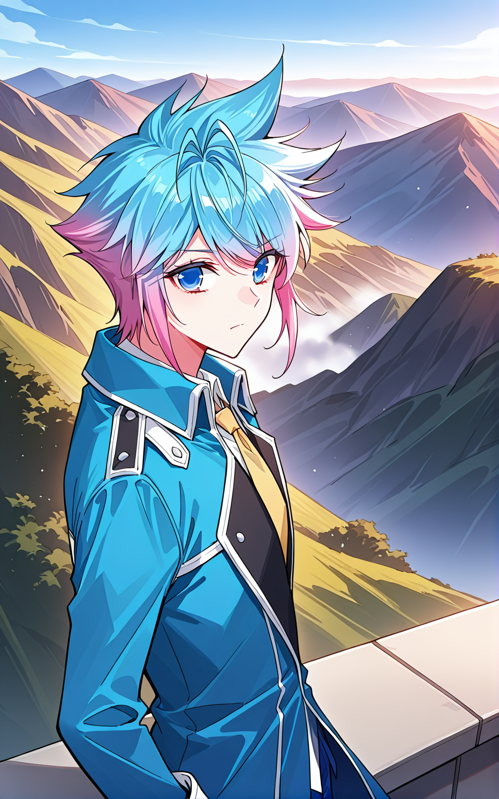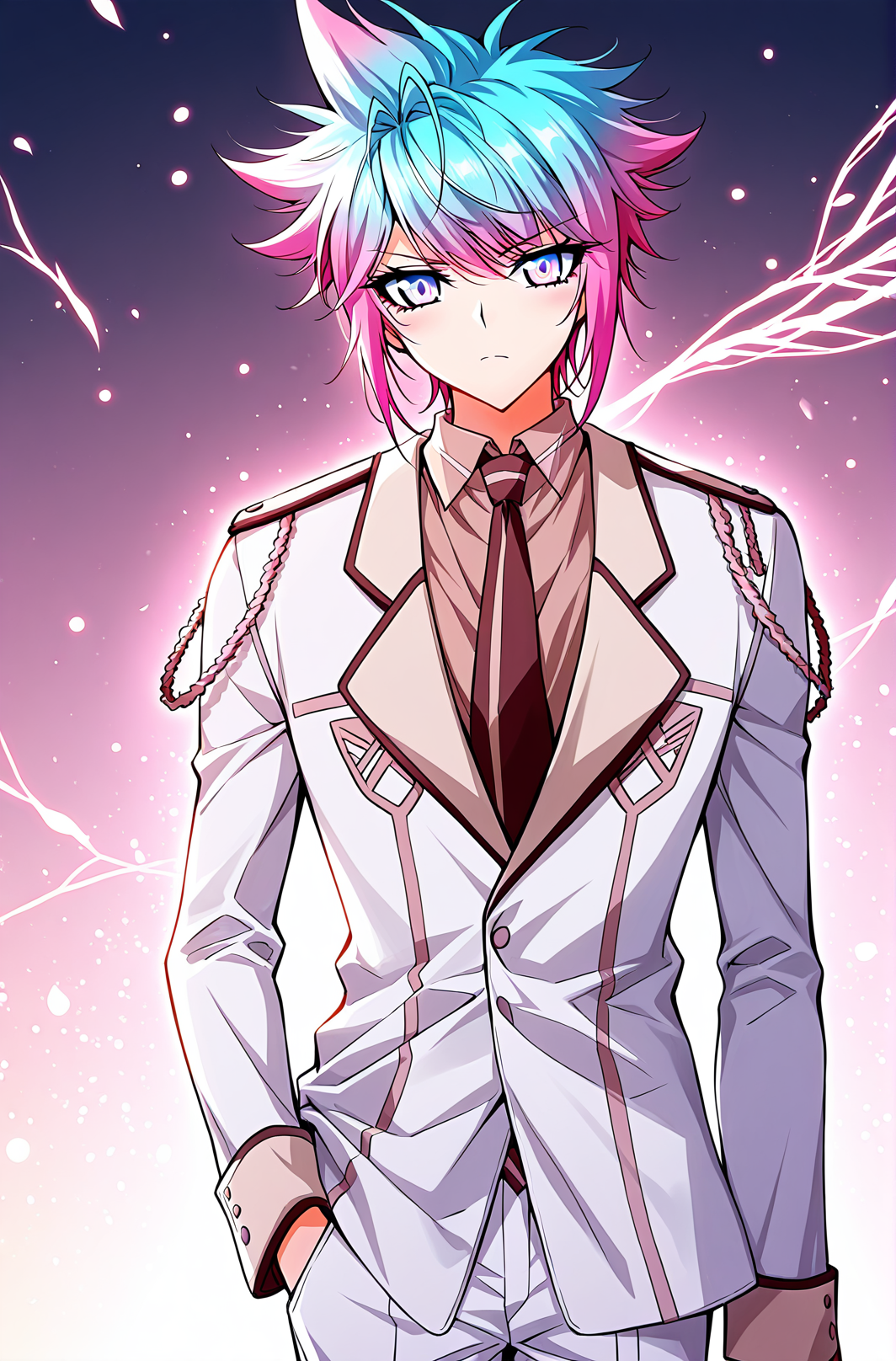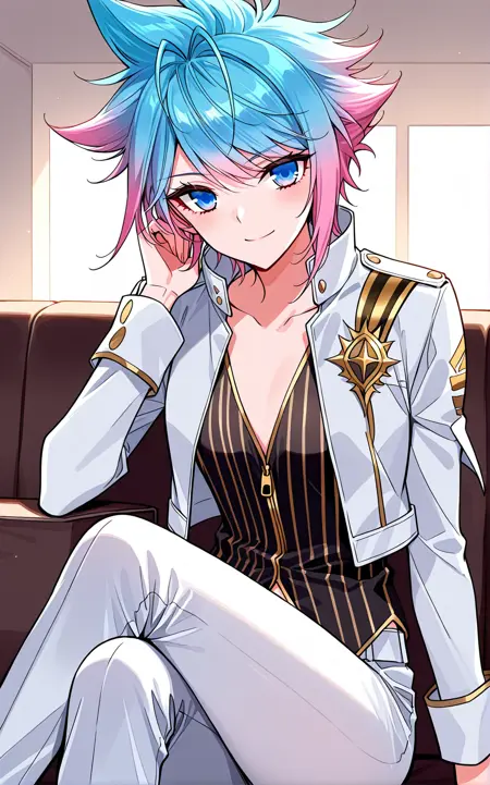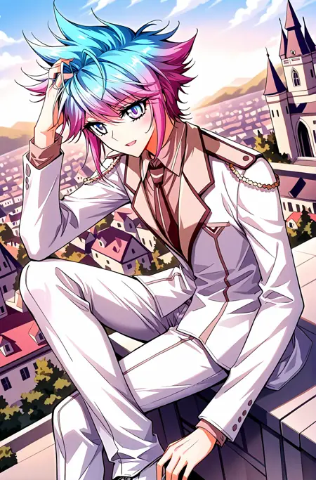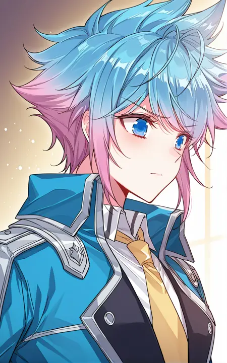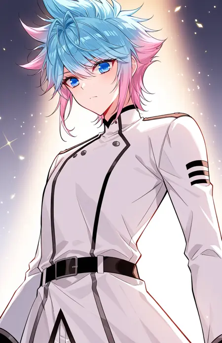 | 训练词汇 | Dong, 1 girl, solo, short hair, spiky hair, gradient hair, split-color hair, pink and blue hair, blue hair, pink hair, ahoge, swept bangs, blue eyes,已复制! Dong_outfit01, white jacket, open jacket, gold-trimmed jacket, turned-up collar, black vest, vertical stripes,black zip-up vest, open zipper, v-shaped opening, gold trim, white pants, blue shoes, school uniform, shoulder ornament,已复制! Dong_outfit02, white suit, formal uniform, double-breasted jacket, dark brown trim, brown tie, shoulder epaulets, ornamental cord, golden buttons, white dress shirt, white pants, white shoes,已复制! Dong_outfit03, blue uniform, white shirt, yellow necktie, black lapel, long coat, blue coat, open coat, asymmetrical coat, shoulder armor, blue pants, fantasy uniform,已复制! Dong_outfit04, white long coat, high collar, long tunic, golden trim, diamond pattern, gold pattern, ornamental shoulder piece, dark blue inner layer, wide belt, purple and gold waist sash, long coattails, split hem, purple patterned sash, long coattails, decorative buttons, diamond pattern, gold and blue cuffs, side tassels, white pants已复制! Dong_outfit05, white uniform, black belt, high collar, black trim, long coat tails, closed coat, pants, white pants, white boots已复制! |