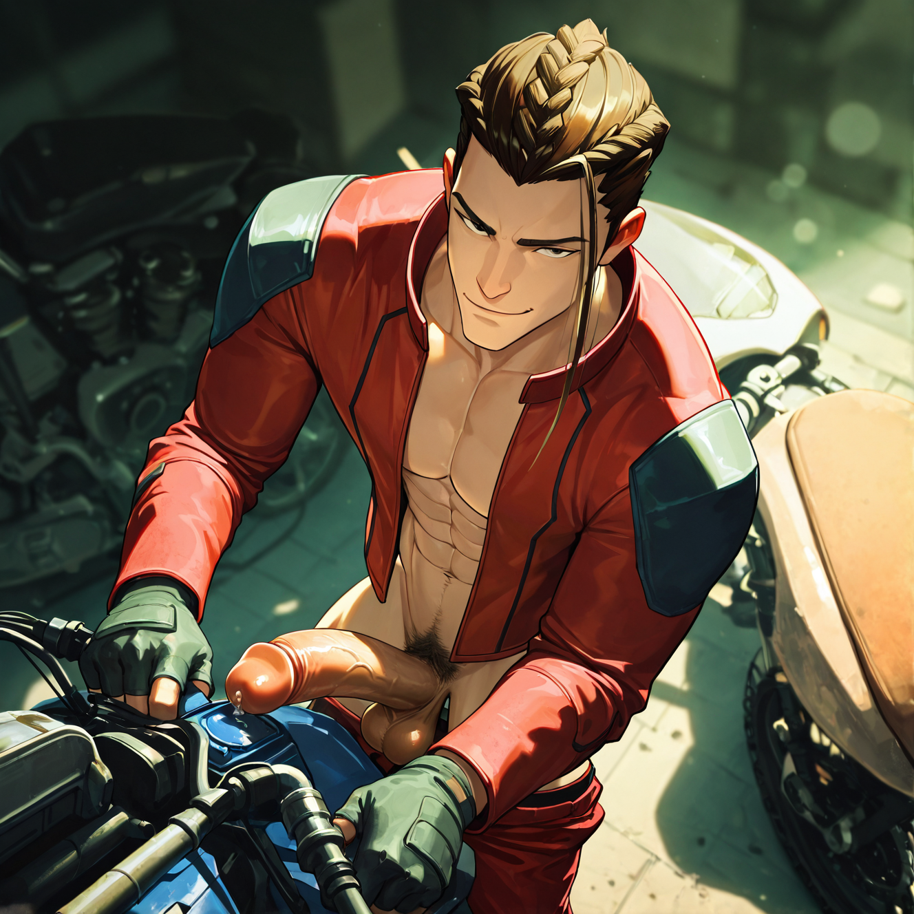 <lora:SPOKE:1> spoke, black hair, 1boy, male focus, brown eyes, shirt, jacket, solo, red jacket, black shirt, short hair, brown hair, blurry, looking at viewer, long hair, hair slicked back, realistic, gloves