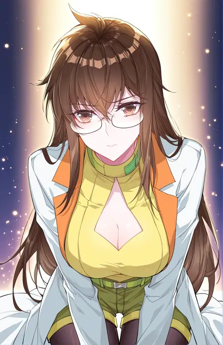 Juzi_Outfit, yellow tight top, cleavage cutout, green details, green shorts, wide green belt, long white coat, lab coat, open coat, orange lapels, black pantyhose,