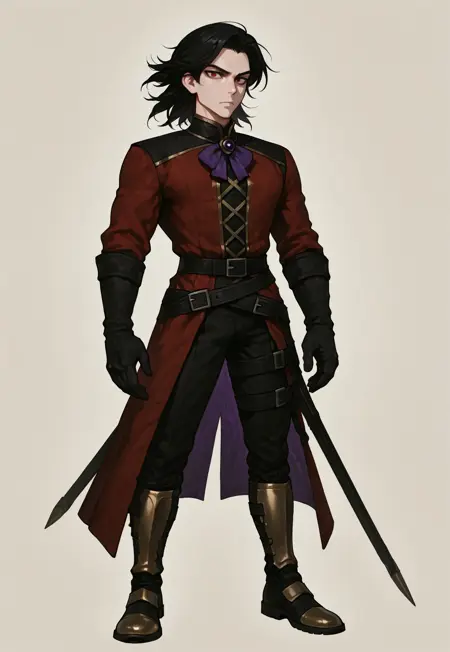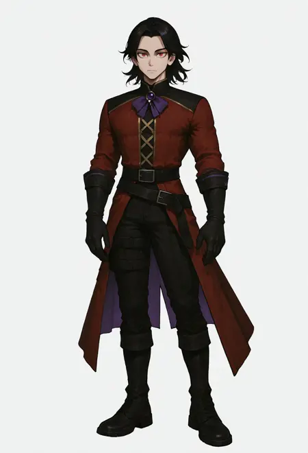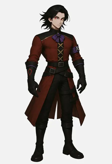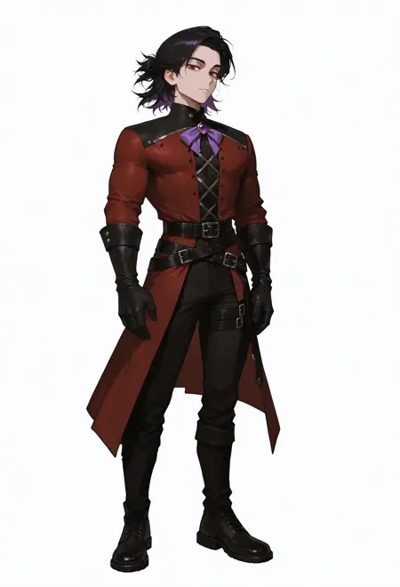 | 학습된 단어 | 1boy, Lancy, solo, male focus, red eyes, black hair, stylish hairstyle, multiple belts, purple bow, purple jewel, red coat, long tailcoat, purple inner tailcoat, black shoulders, golden lines, crossed buttons, x buttons, black gloves, single long glove, single short glove, black cuffs, black belt, multiple belts, black pants, soldier black and golden boots, metal box on waist, belt with metal box, black and silver box복사됨! |