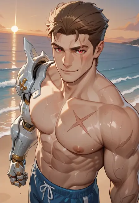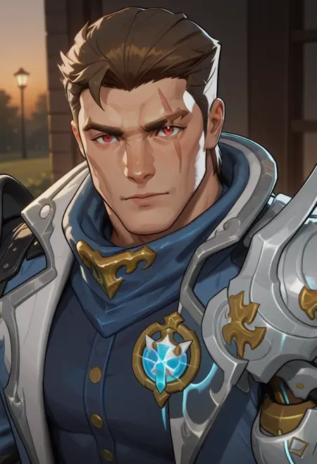 蓝色服装请使用:WsBsMR, ws_bluenwhitevarient, ws_bluevarient, 棕发, 一只白色机械臂, 红眼, 眼部疤痕, 蓝色外套、灰色裤子、蓝色衬衫、蓝色袖子
