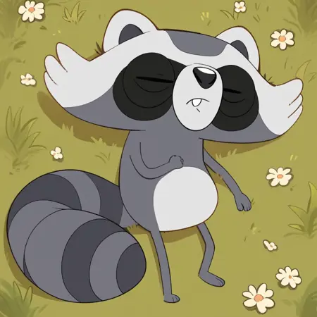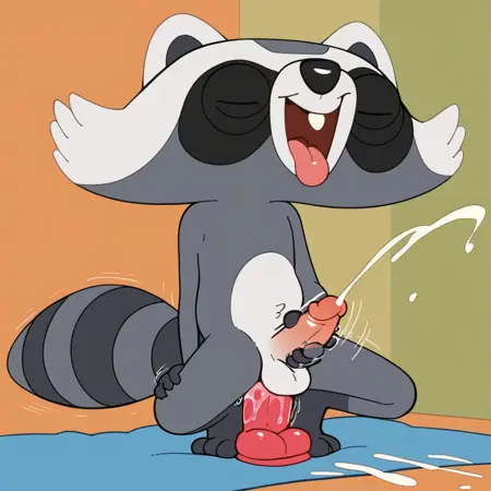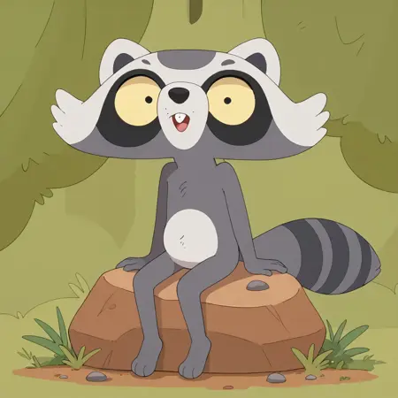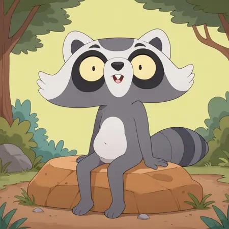 raccoon, raccoon boy, gray and black fur, white snout, black nose, black pupils, yellow sclera, bushy raccoon tail, bucktooth,