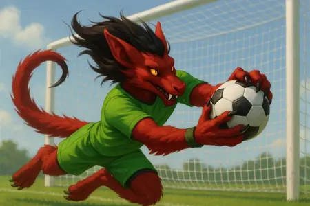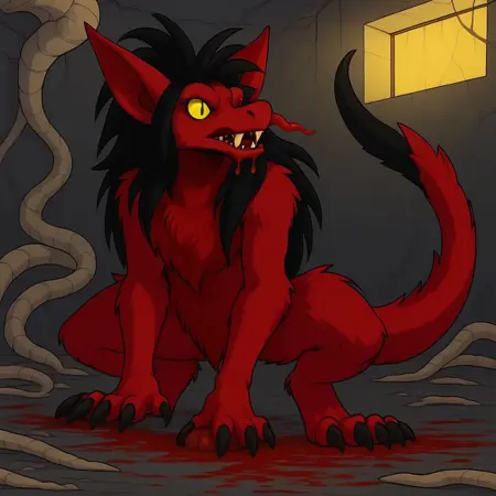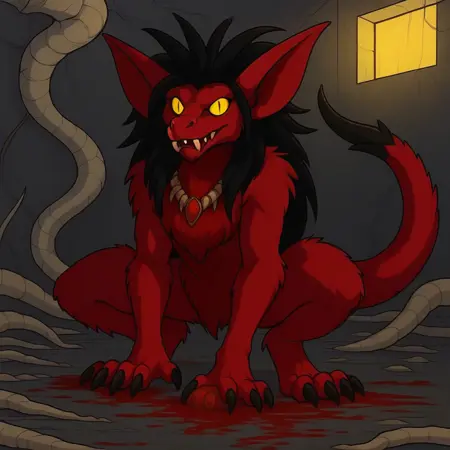 毛茸茸的,蝙蝠耳朵,血红色毛发,锋利的爪子,手腕上装有蛛丝发射器,狼的身体,尖锐的獠牙,蛇眼,黄色眼睛,龙首,龙尾,长发,凌乱的头发,黑发,龙尾毛茸茸且蓬松,尾尖覆盖着坚硬的黑色甲壳状物质,尖锐的尖端,无犬类面部,无犬类鼻子,无鼻角,无鳞片,无角,拟人化,拟人生物
