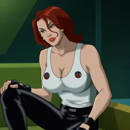 탱크탑 포함 트리거: natashaultimateavengers, 1girl, medium breasts, green eyes, cleavage, fingerless gloves, red hair, earrings, tank top, jewelry, pants, lipstick, lips, giant breasts