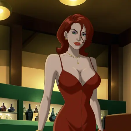 드레스 포함 트리거: natashaultimateavengers, 1girl, jewelry, red dress, medium breasts, green eyes, cleavage, earrings, red hair, necklace, bracelet, red nails, lipstick, makeup, nail polish, giant breasts