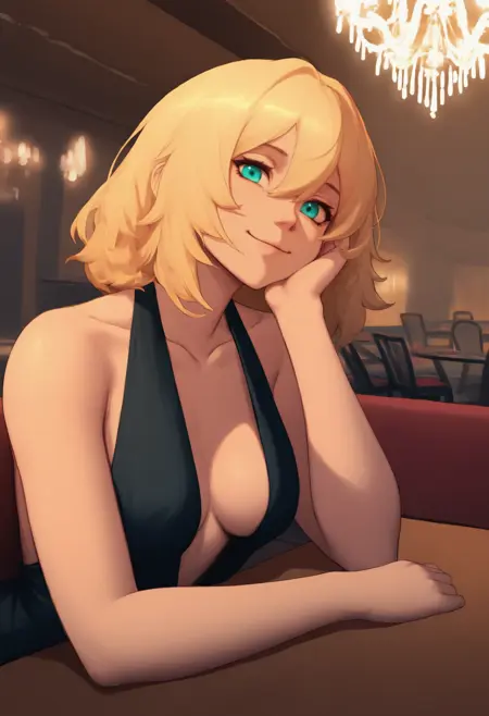 Trigger + Appearance: medium hair, blonde hair, hair between eyes, aqua eyes