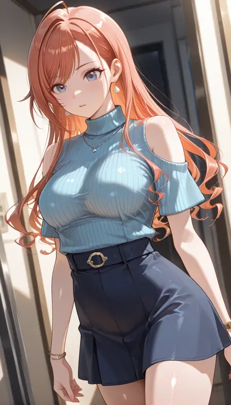 1. 치마, 보석, 어깨 노출, 짧은 소매, 허벅지, 귀걸이, 벨트, 검은 치마, 미니스커트, 목걸이, 스웨터, 팔찌, 파란 치마, 의상 컷아웃, 터틀넥, 홈짜 스웨터, 허리 높은 치마, 시계, 터틀넥 스웨터, 팔목시계, 어깨 컷아웃, 파란 스웨터, 홈짜 셔츠