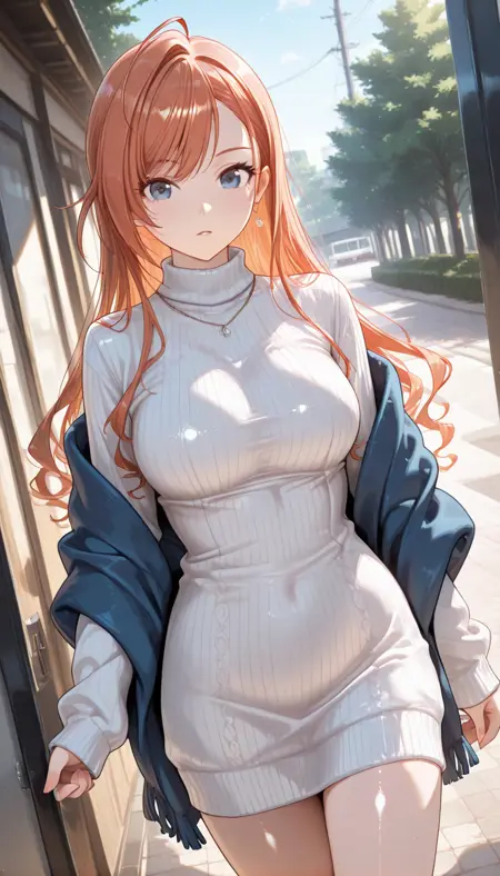 2. 긴 소매, 드레스, 보석, 허벅지, 흰 드레스, 목걸이, 스카프, 스웨터, 터틀넥, 짧은 드레스, 홈짜 스웨터, 터틀넥 스웨터, 샬, 흰 스웨터, 파란 스카프, 스웨터 드레스, 프린지 테두리, 홈짜 드레스, 터틀넥 드레스, 파란 샬, 손톱, 나무, 소매가 손목을 넘음,