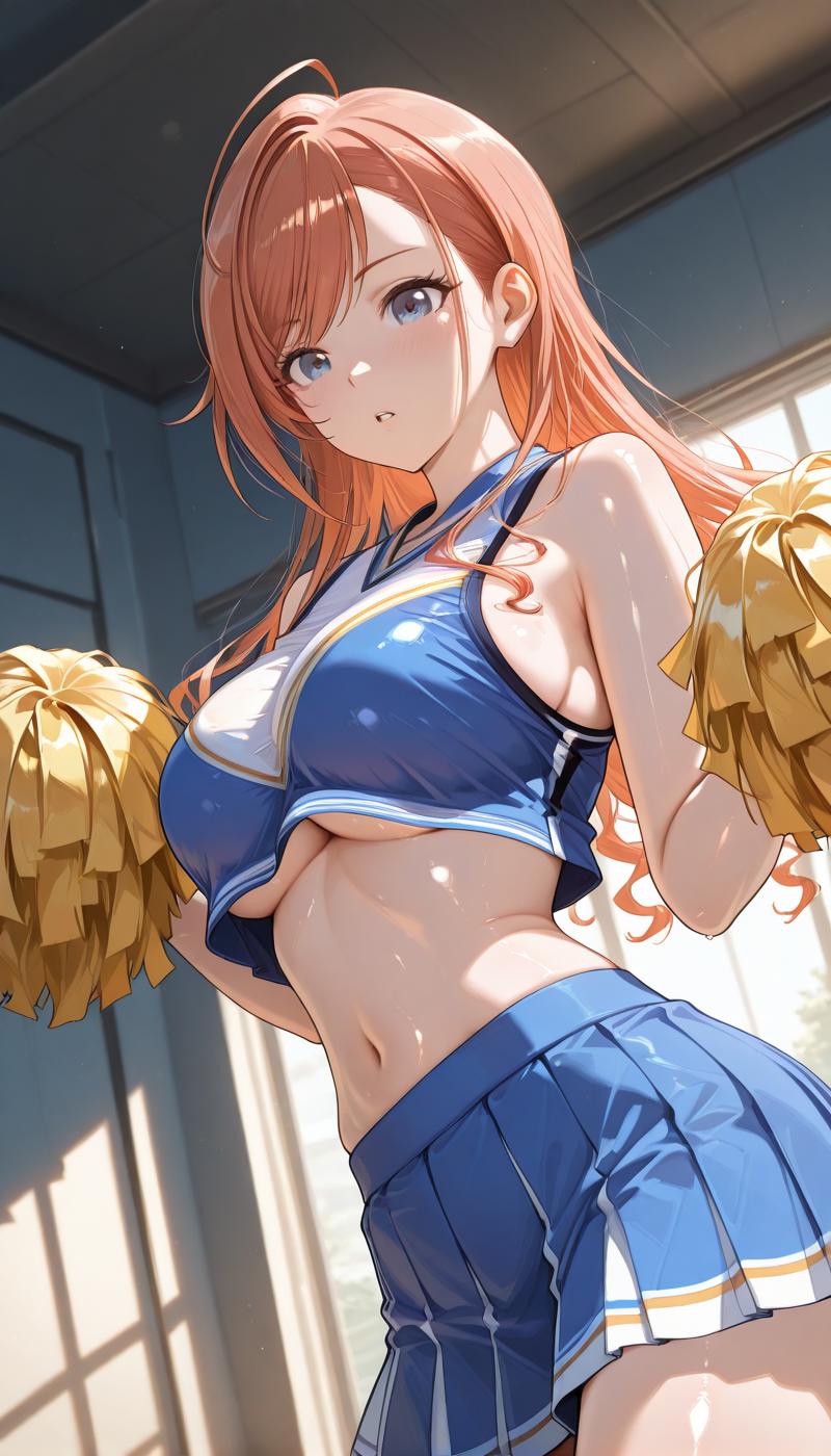 4. 셔츠, 치마, 들고 있음, 활, 배꼽, 어깨 노출, 허벅지, 주름 치마, 소매 없음, 허리, 미니스커트, 복부, 크롭탑, 파란 치마, 소매 없는 셔츠, 옆가슴, 브라 미착용, 아래가슴, 파란 셔츠, 치어리더, 폼폼(치어리딩), 크롭 상의, 크롭탑 튀어나옴, 폼폼 들고 있음, 팔 노출