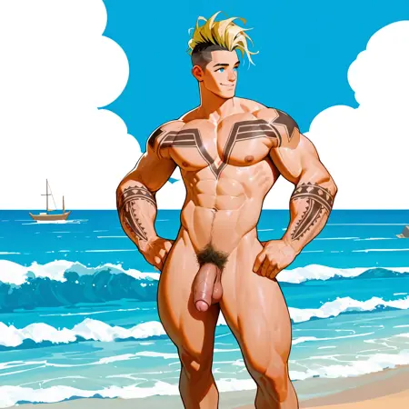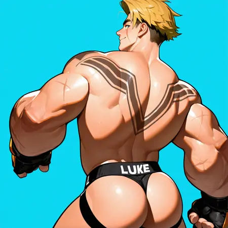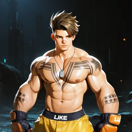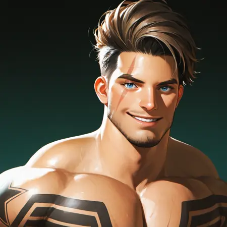 <lora:LUKE_SULLIVAN:1> luke, 男性焦点, 短发, 肌肉发达, 1个男孩, 肌肉男性, 单人, 胸肌, 疤痕, 项链, 饰品, 微笑, 脸上疤痕, 金发, 纹身, bara, 军牌, 看着观众, 手套, 眼睛上的疤痕, 胸部纹身, 蓝眼睛, 棕发