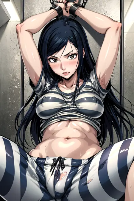刑務所衣装の場合は striped, striped shirt, striped shorts, midriff を使用してください。また、代わりに striped bikini を使ってもOKです!もちろん!+_+