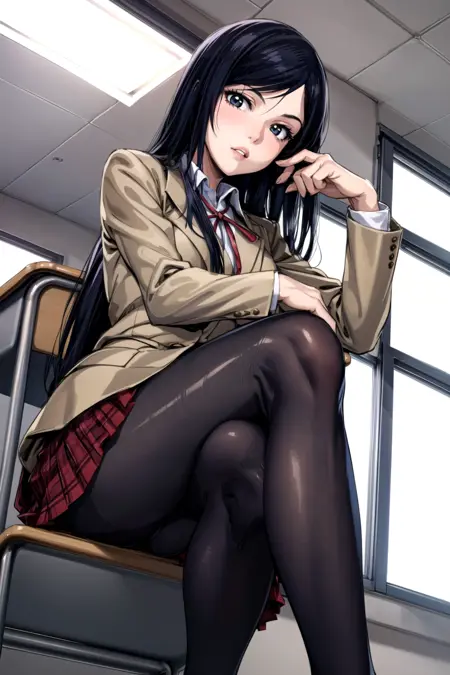 使用する主なフレーズは kurihara mari \(prison school\) で、通常の衣装には school uniform, neck ribbon, pleated skirt, pantyhose を利用してください。white shirt を追加すると、ほとんどの場合ジャケットが生成されるので、目的の衣装に合わせてご利用ください。