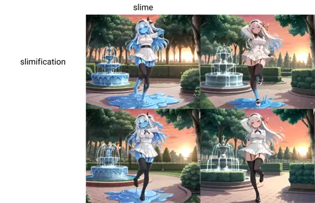 The LoRA is trained on a variety of images and focused on the following core concepts: Slime Girl, Slime transformations (Slimification), and Yuri/Hetero Slime Sex. Future releases will further define each of those three core concepts with a version dedicated to each one.