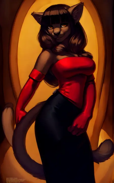 强化标签:动物耳朵、棕色头发、毛茸茸、深色皮肤、毛茸茸女性、猫耳、棕色眼睛、红色手套、琥珀色眼睛、长发、动物鼻子、刘海、整齐刘海、双马尾、猫尾**