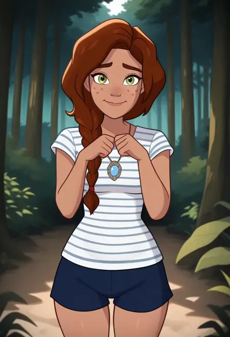 EmilyJones, side braid, light-skinned, brown hair, green eyes, freckles,