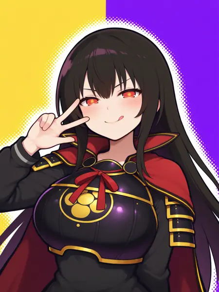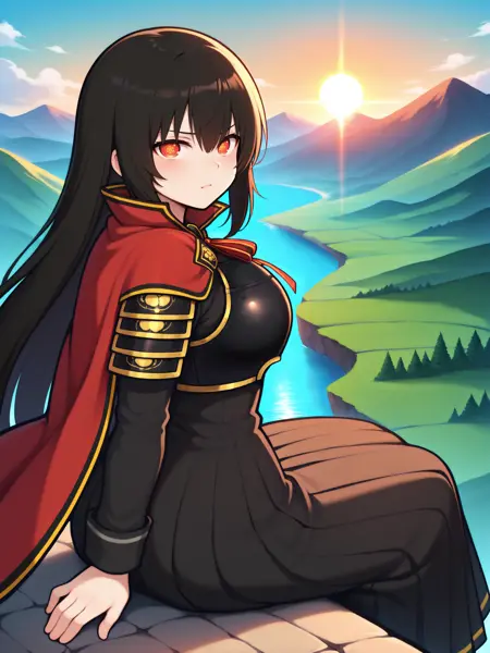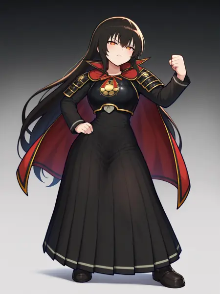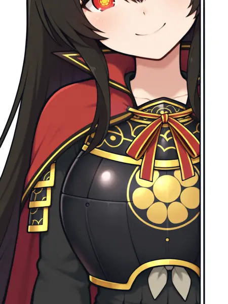 变身服装的触发词为:“Kagura_transformed,长裙,黑色长裙,灰色丝带领结,武士胸甲,金色纹路甲胄,袖甲,红色披风,高耸红色衣领,红色颈带,长袖,蓬松褶皱裙摆,深色袜子,黑色乐福鞋”。